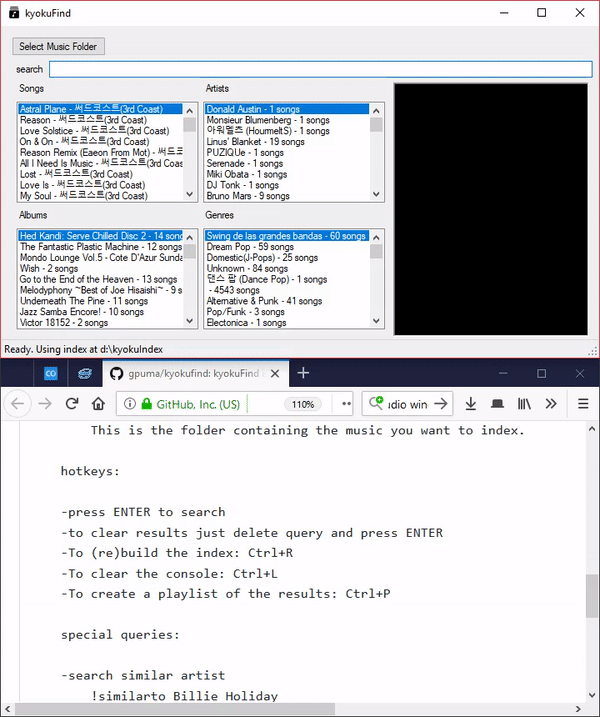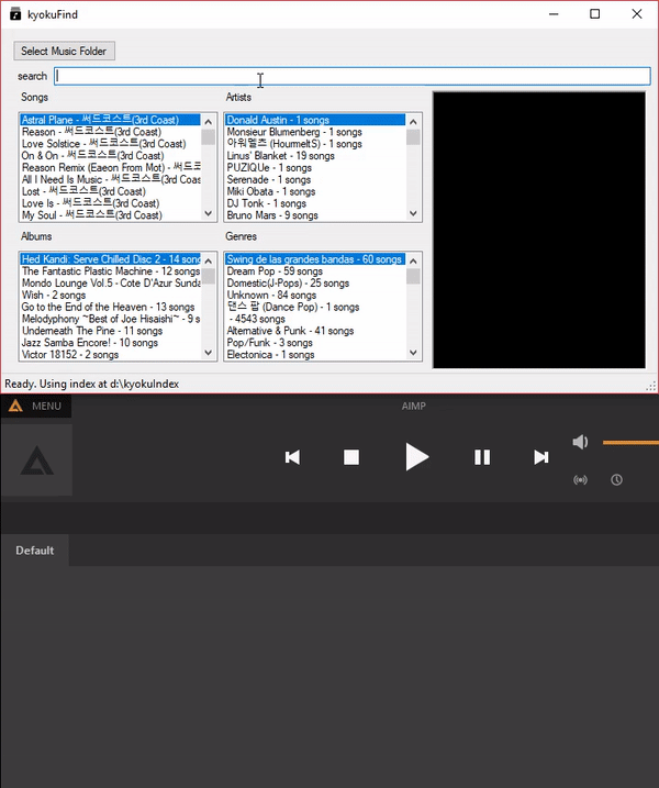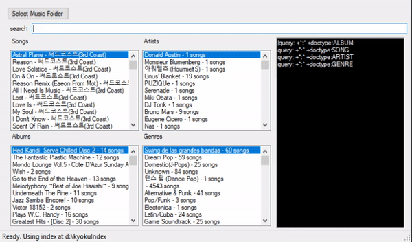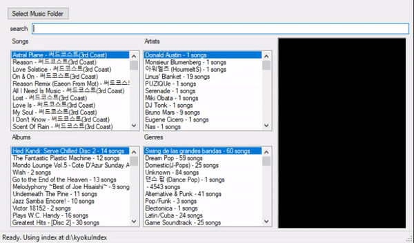 kyokuFind is a local music library application for Windows, written in C# using the Lucene Search Engine library.