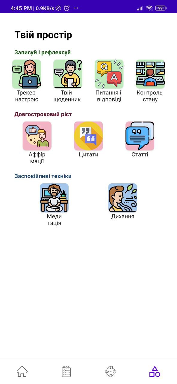 itHelps The project is designed to cover all basic mental health and mindfulness needs. The project is still under development. But you can already see some screenshots.
