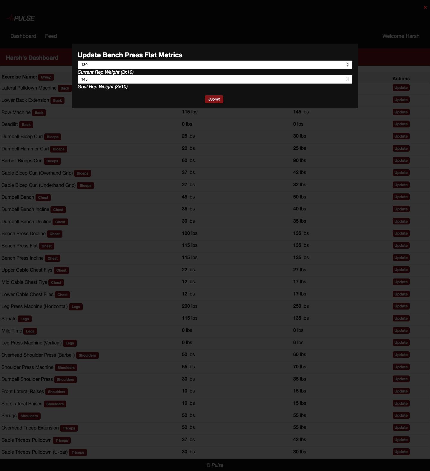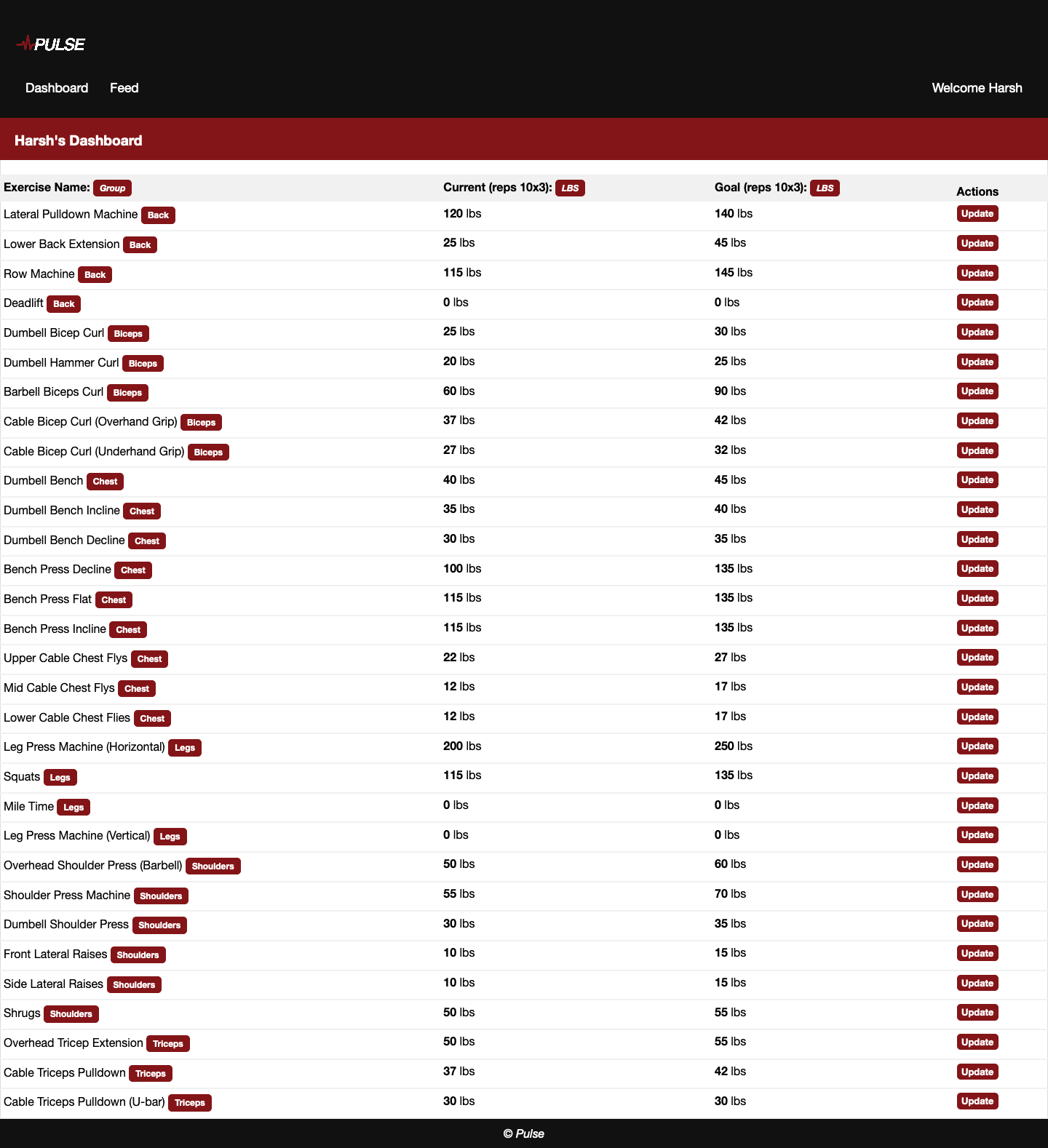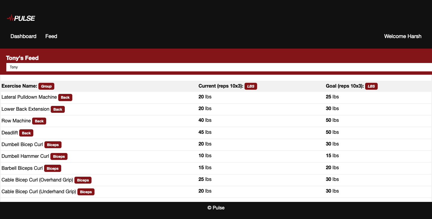 Pulse An intuitive fitness tracker that keeps track of your progress in the gym Overview Allows for users to enter goal and rep weights for excercises, and then they may broadcast these stats with their friends. Built with Vue.js, Web2Py. Demo: Pulse Screenshots