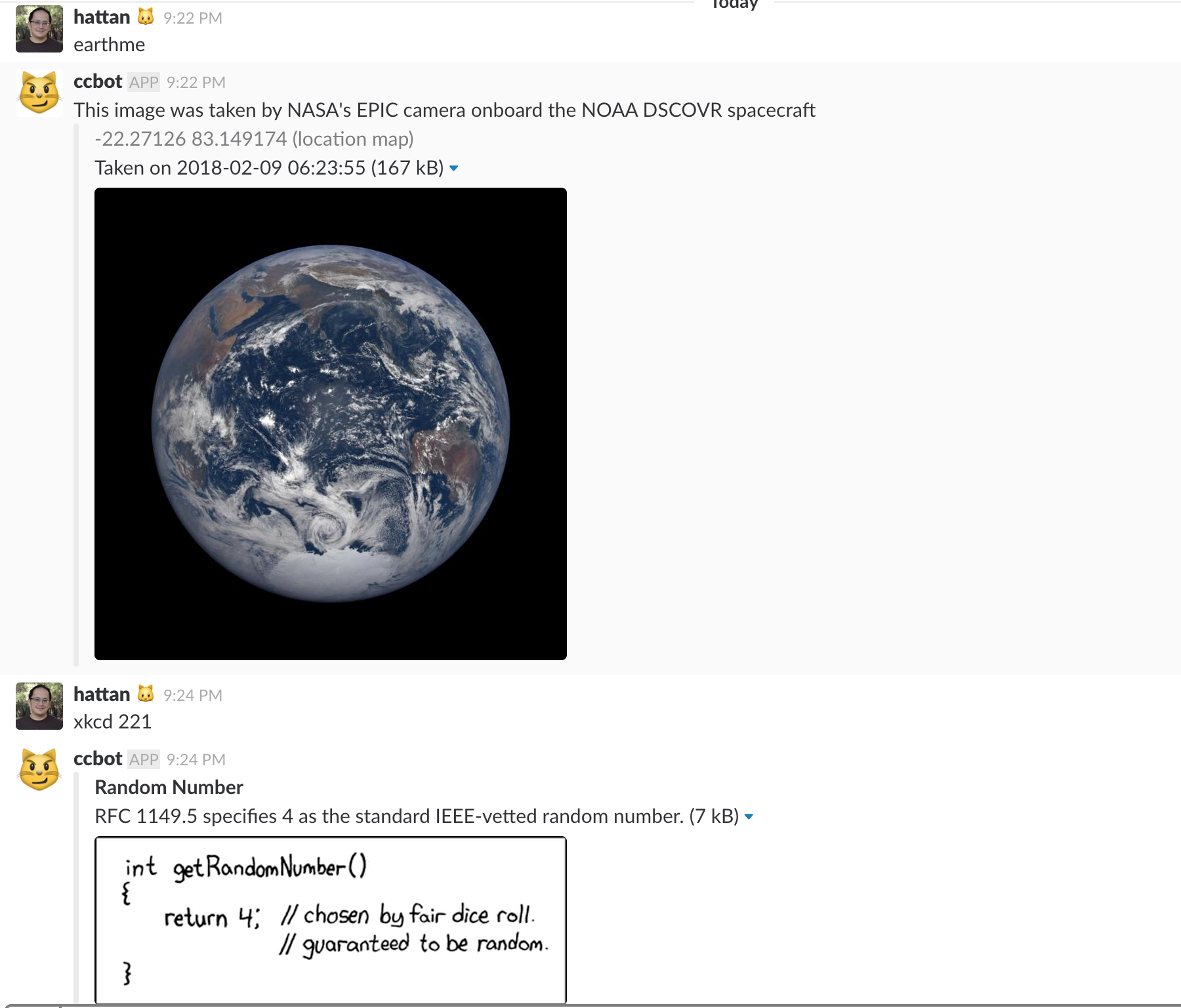 tacome[zip code] - shows a random yelp business categorized 'tacotrucks' with term 'taco'ccbot- generic ccbot command. ccbot must be invoked with a command in the form ccbot [command]. Commands are mapped to functions that start with "action_"- ccbot tell_joke - grabs a dad joke and displays the text