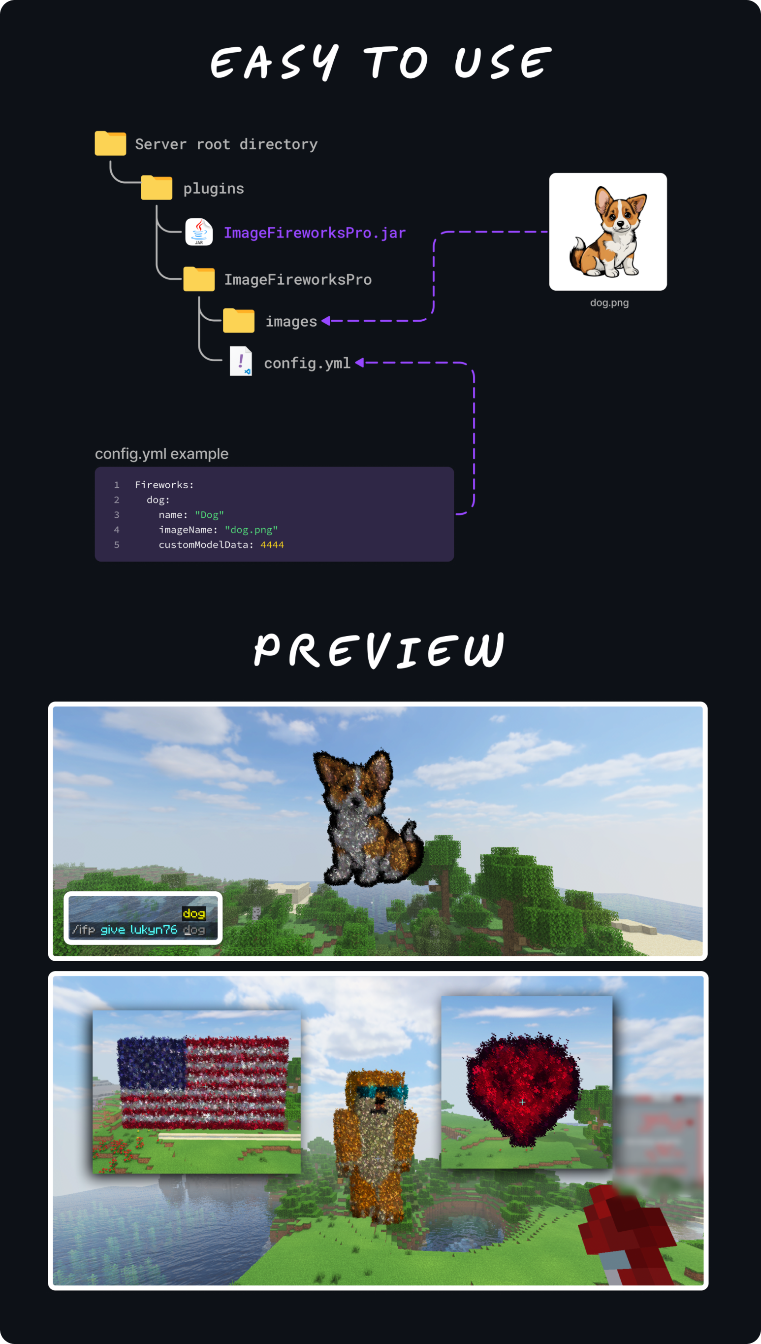 In-game, use command /ifp give <player> <firework> [amount] to obtain the image firework or launch a firework rocket with the same customModelData to display the image.