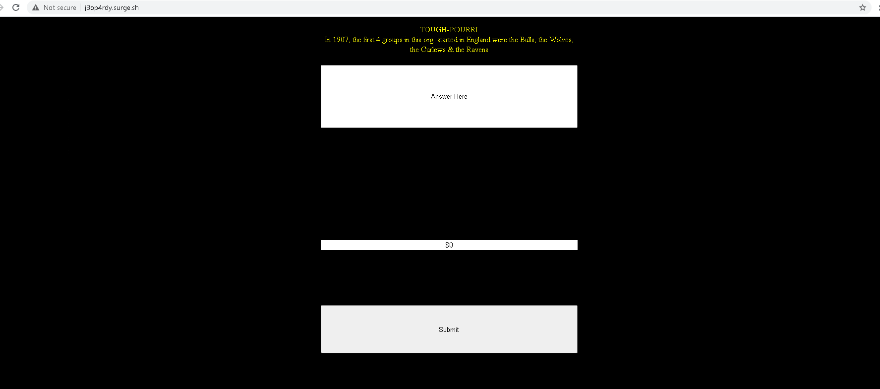 Any click in the title screen prompts the gamae. Contestant clicks any tile, and is prompted a question, once the prompt is answered we check and see if our contestant gets the money. If they get the money, their money increments, the box is then set to blank. Daily double decrements the total amount by the wager. This repeats 30 times unitl the board is cleared