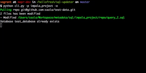 - ".sql"With this example we are defining a project called hive_project that it's using hive backend to update all the queries stored in the repo git@github.com:ssola/test-data.git. Because we are only intested in sql files we are defining the filter. This filters cleans up the list of updated files deleting any file which extension isn't .sql
