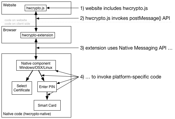 hwcrypto-extension (LGPL) is a reference implementation of a modern browser extension that provides access to cryptographic smart card services of the host computer via Native Messaging. The extension is available for Chrome/Chromium, Firefox and Opera.