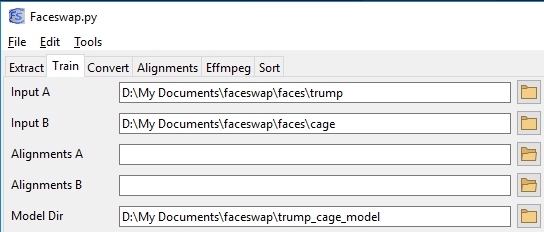 python faceswap.py train -A ~/faceswap/faces/trump -B ~/faceswap/faces/cage -m ~/faceswap/trump_cage_model/