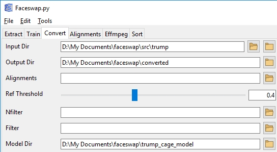 python faceswap.py convert -i ~/faceswap/src/trump/ -o ~/faceswap/converted/ -m ~/faceswap/trump_cage_model/GUI: