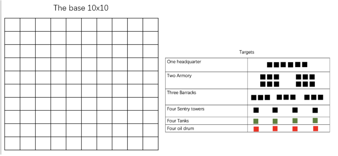 In the game, you serve as a soldier and your mission is destroying a 10x10 enemy base. You need to destroy all Targets in the base.