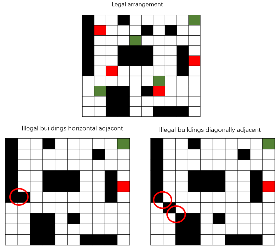 Before the game begins, the program places all targets randomly in such a way that no buildings are immediately adjacent to each other, either horizontally, vertically, or diagonally. Take a look at the following diagrams for examples of legal and illegal placements. (Notes: Tanks and oil drums are not buildings, so they could be placed directly adjacent to each other, or to buildings.)