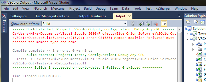 VSColorOutput is a Visual Studio 2010/2011 extension that adds color highlighting to Visual Studio's Build and Debug Output Windows. Errors are in Red, Warnings in Yellow, build headers are Green.