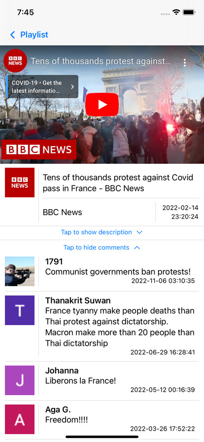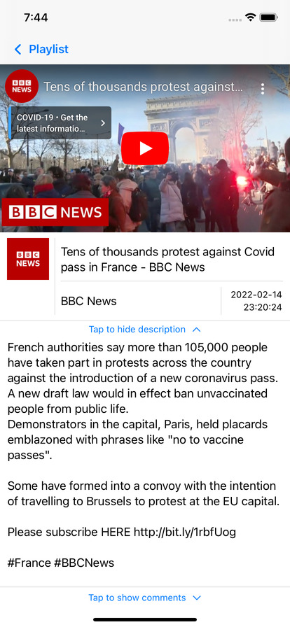 If you tap on a video thumbnail, it will start playing the video. To hide or show the video description or comments, tap on the "Hide/Show Description/Comments" button. Additionally, to load more comments on the video, scroll to the bottom of the comments section.