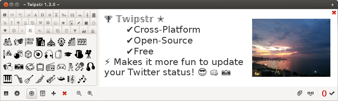 Well... There's a plenty of Twitter clients out there, I know. Lot of them make it fun to read your Twitter stream. But I had no luck to find one that makes it really fun to update your Twitter status. That is why I decided to create Twipstr. It's minimalistic, but it does its job well. And you'll love those handy pictograms! Created for people who want to post tastefully ;)