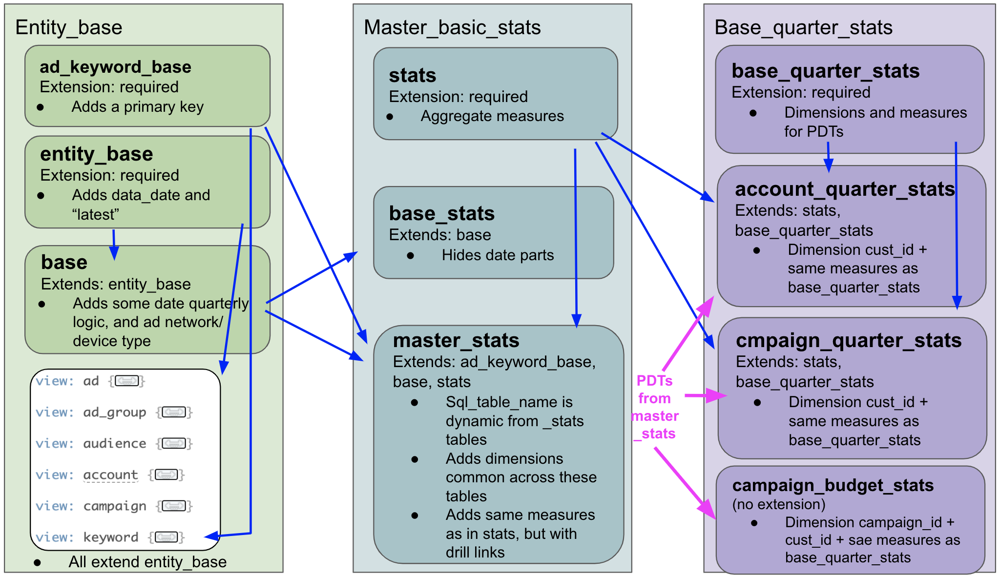 Entity Base - This file contains all the common entity tables found across all AdWords deployments. If you have additional entities you'd like to include, simply bring them into the Looker and model them the same way. Full documentation on each entity table and each metric can be found in Google's documentation.