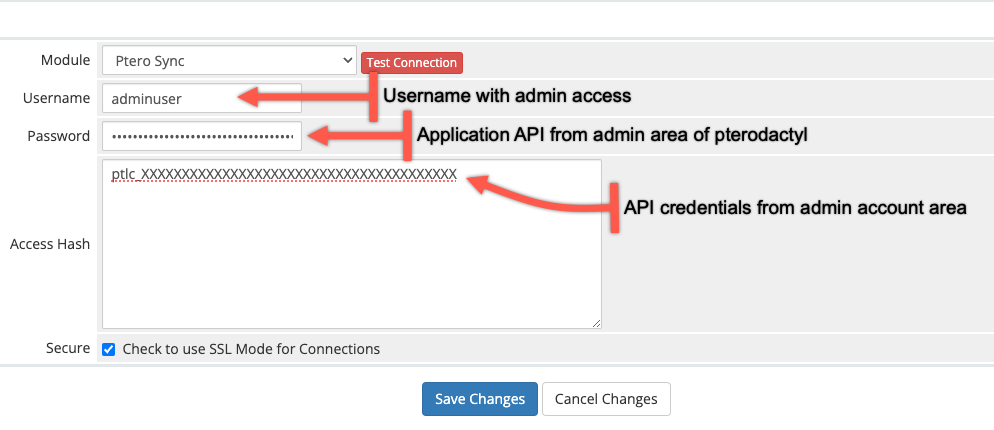 - In Pterodactyl, create an Application API key with necessary permissions and put it in the Password field of WHMCS.
