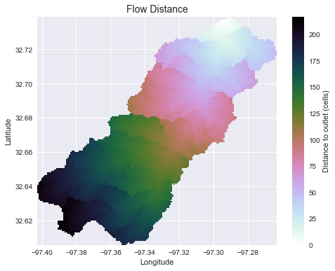dist = grid.distance_to_outlet(x=x_snap, y=y_snap, fdir=fdir, dirmap=dirmap,