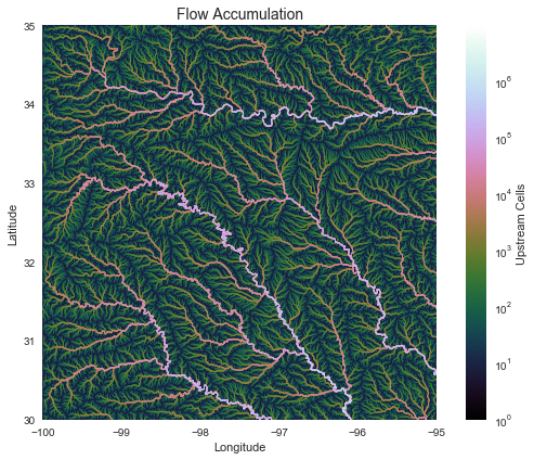 acc = grid.accumulation(fdir, dirmap=dirmap)Plotting code...