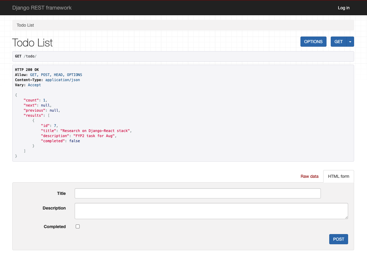 HTTP/1.1 200 OK Allow: GET, POST, HEAD, OPTIONS Content-Length: 153 Content-Type: application/json Date: Sat, 10 Jul 2021 03:56:59 GMT Referrer-Policy: same-origin Server: WSGIServer/0.2 CPython/3.9.5 Vary: Accept, Cookie X-Content-Type-Options: nosniff X-Frame-Options: DENY { "count": 1, "next": null, "previous": null, "results": [ { "completed": false, "description": "FYP2 task for Aug", "id": 7, "title": "Research on Django-React stack" } ] } - Using curl:
