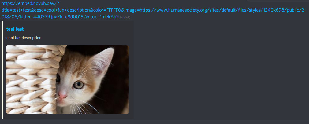 direct image url +and%20represent spaces. i.e: embed.novuh.dev/?title=title&desc=description+here%20space