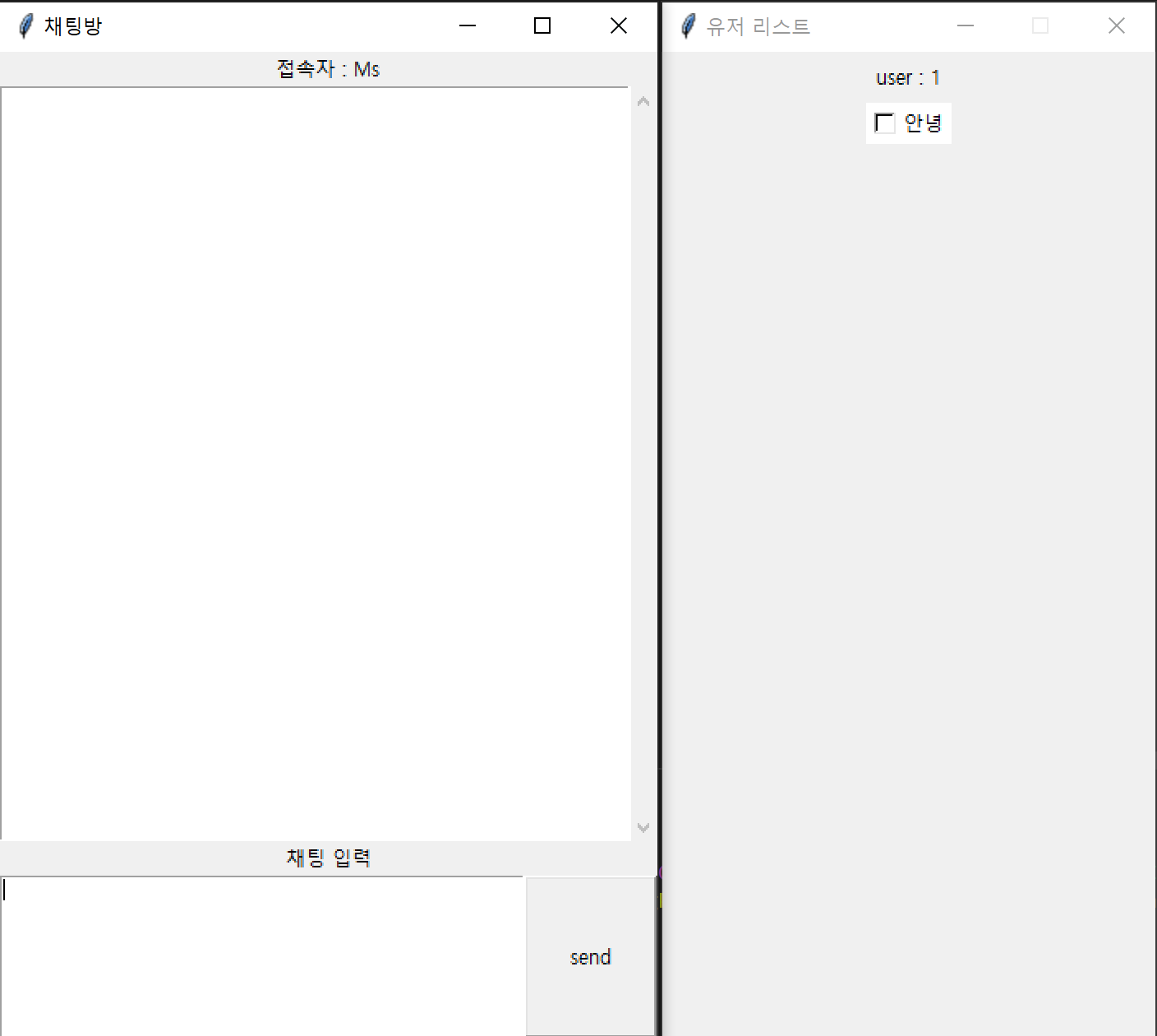 로그인에 성공하면 다음과 같은 채팅창이 나옵니다. (우측 유저 리스트는 개발중)