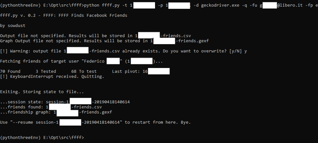 python3 ffff.py -fu myaccount@facebook.com -fp Passw0rd -t 00000000 -p 00000001 -o results.csv -g graph.gexf -q --driver-path geckodriver.exe