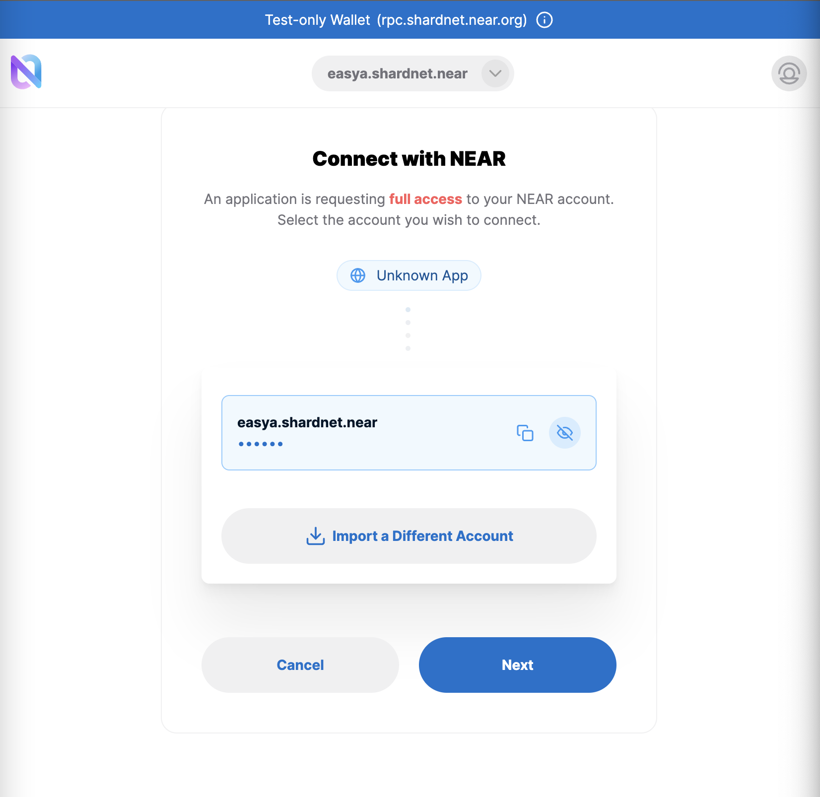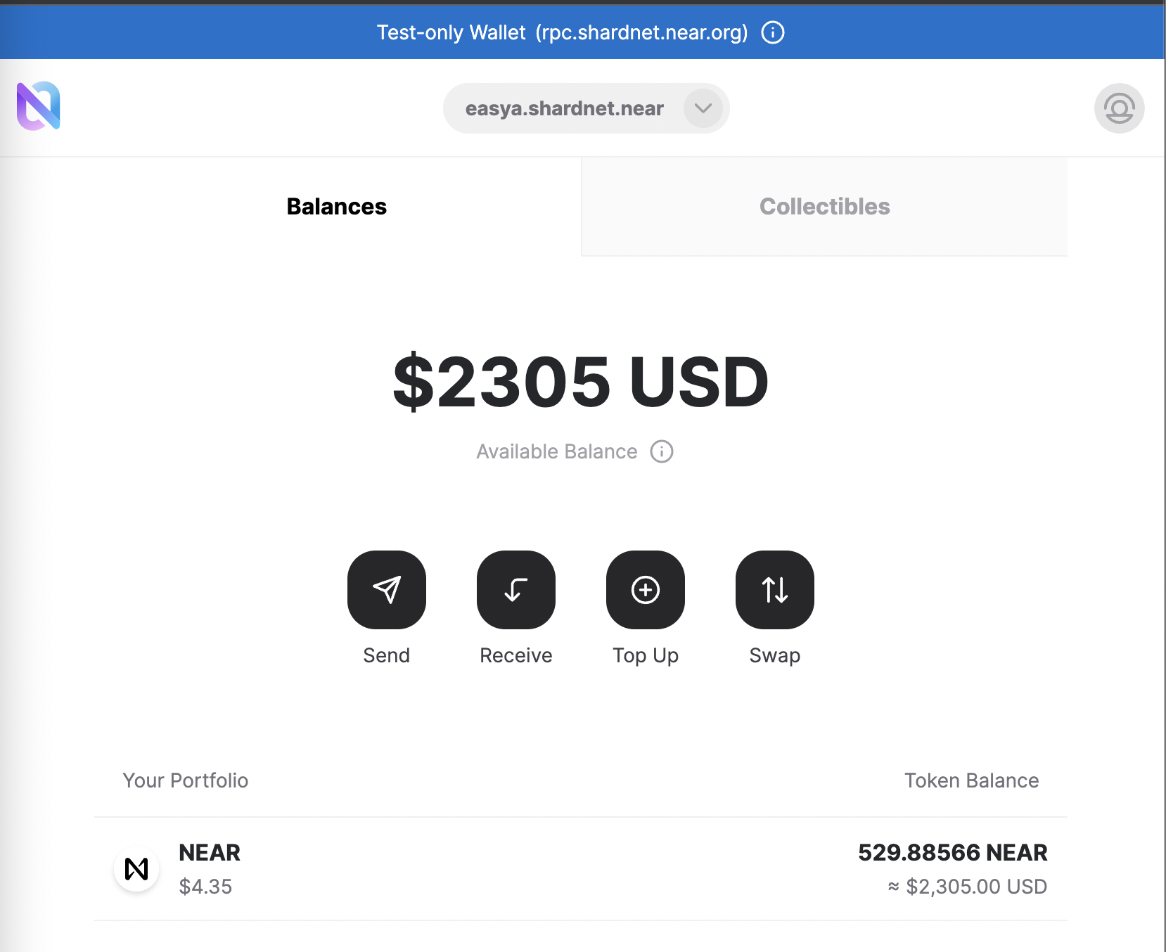 Wallets in the Stake Wars world are different. We need a special one to participate in this battle. Head over to https://wallet.shardnet.near.org/ and create yours! On creating the wallet, you'll immediately be credited with test NEAR. Here's what it will look like: