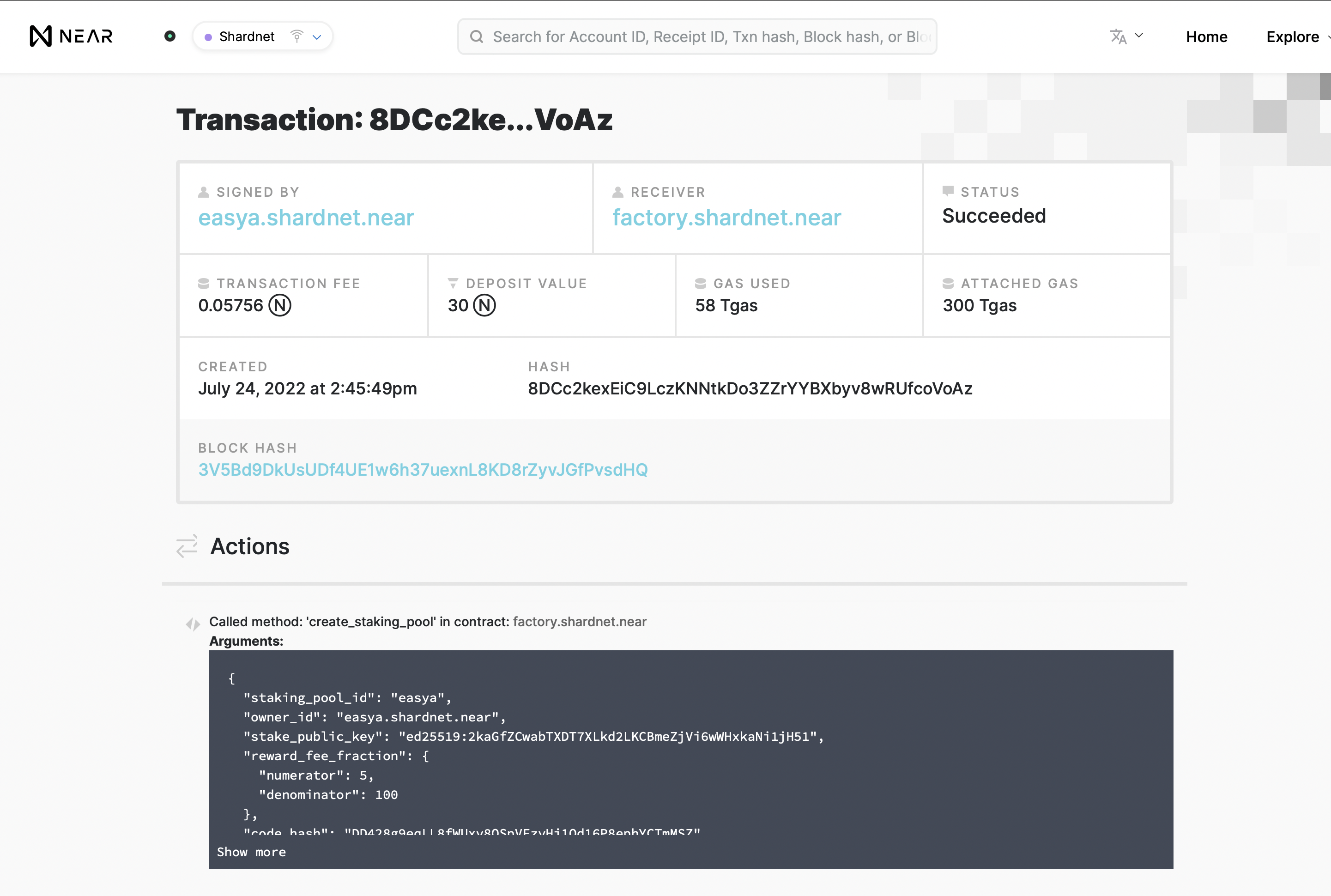 near call factory.shardnet.near create_staking_pool '{"staking_pool_id": "<pool id>", "owner_id": "<accountId>", "stake_public_key": "<public key>", "reward_fee_fraction": {"numerator": 5, "denominator": 100}, "code_hash":"DD428g9eqLL8fWUxv8QSpVFzyHi1Qd16P8ephYCTmMSZ"}' --accountId="<accountId>" --amount=30 --gas=300000000000000