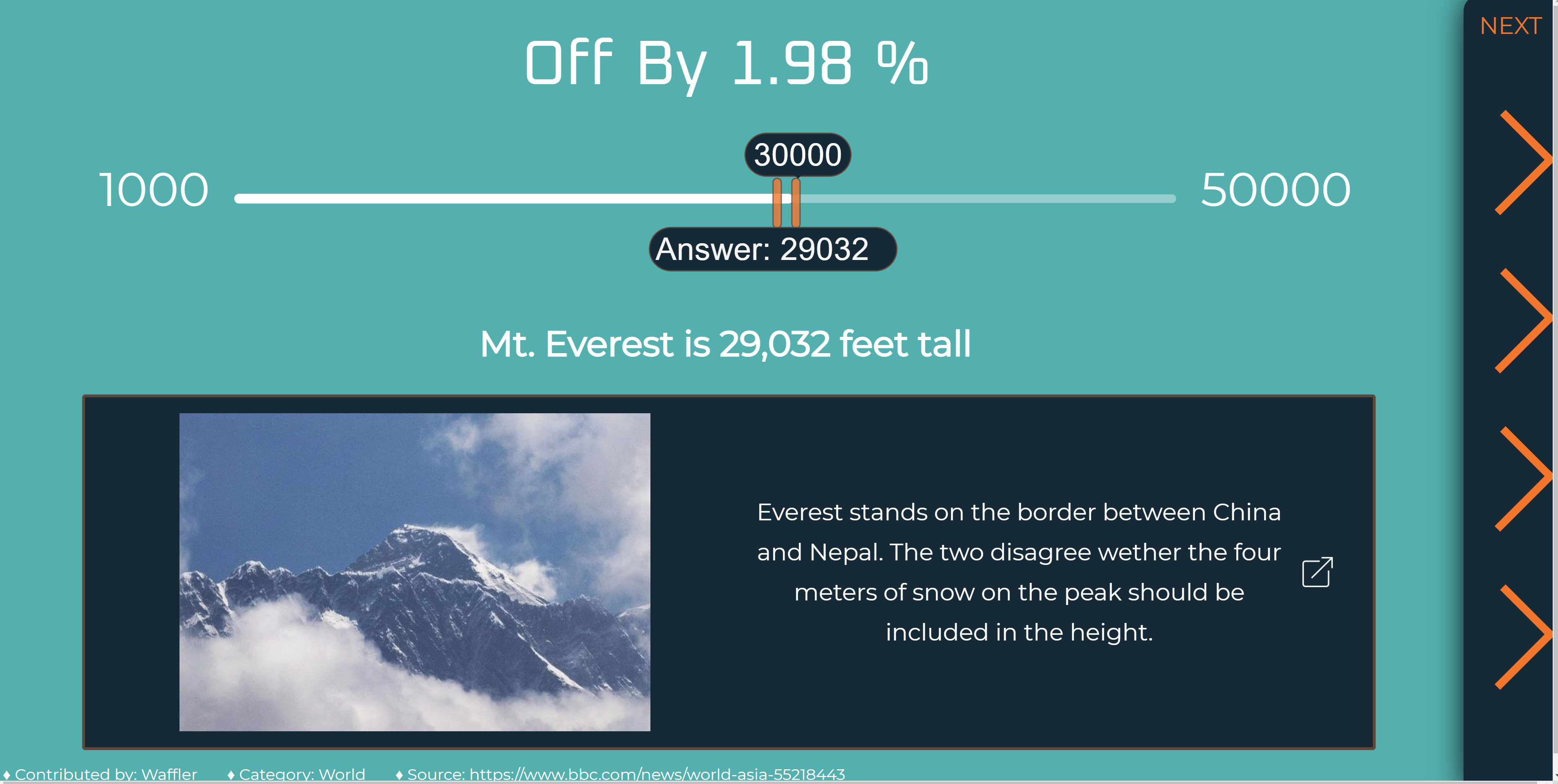 Numbers based trivia game where you'll never be wrong, only off by X%