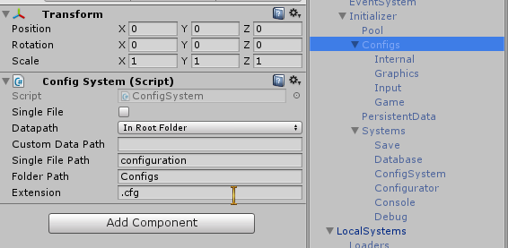 - Uses ConfigBase that is a child of ComponentBase thus it is an ECS Component and is accessible through the Pool