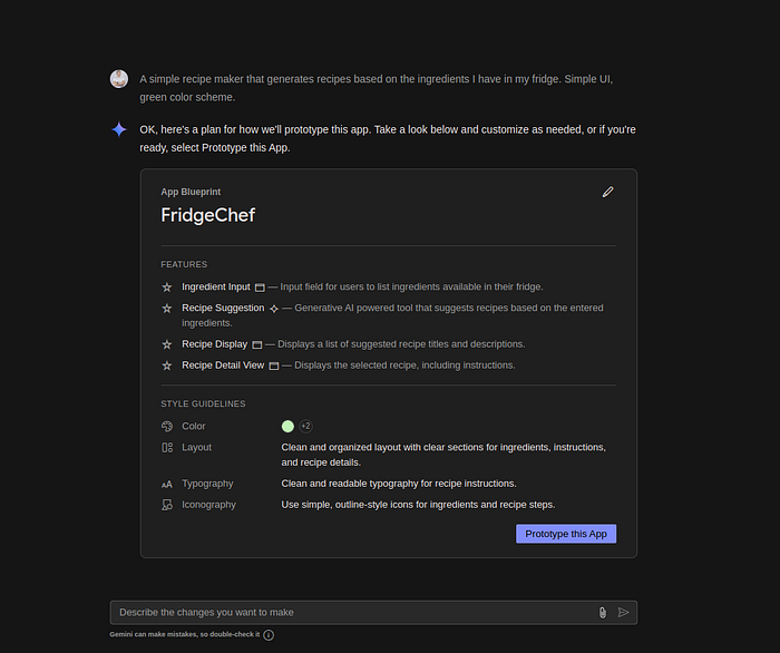 - On the dashboard, locate the “Prototype an app with AI” field. In the input field, enter a natural language description of your app. For example: A simple recipe maker that generates recipes based on the ingredients I have in my fridge. Simple UI, green color scheme.