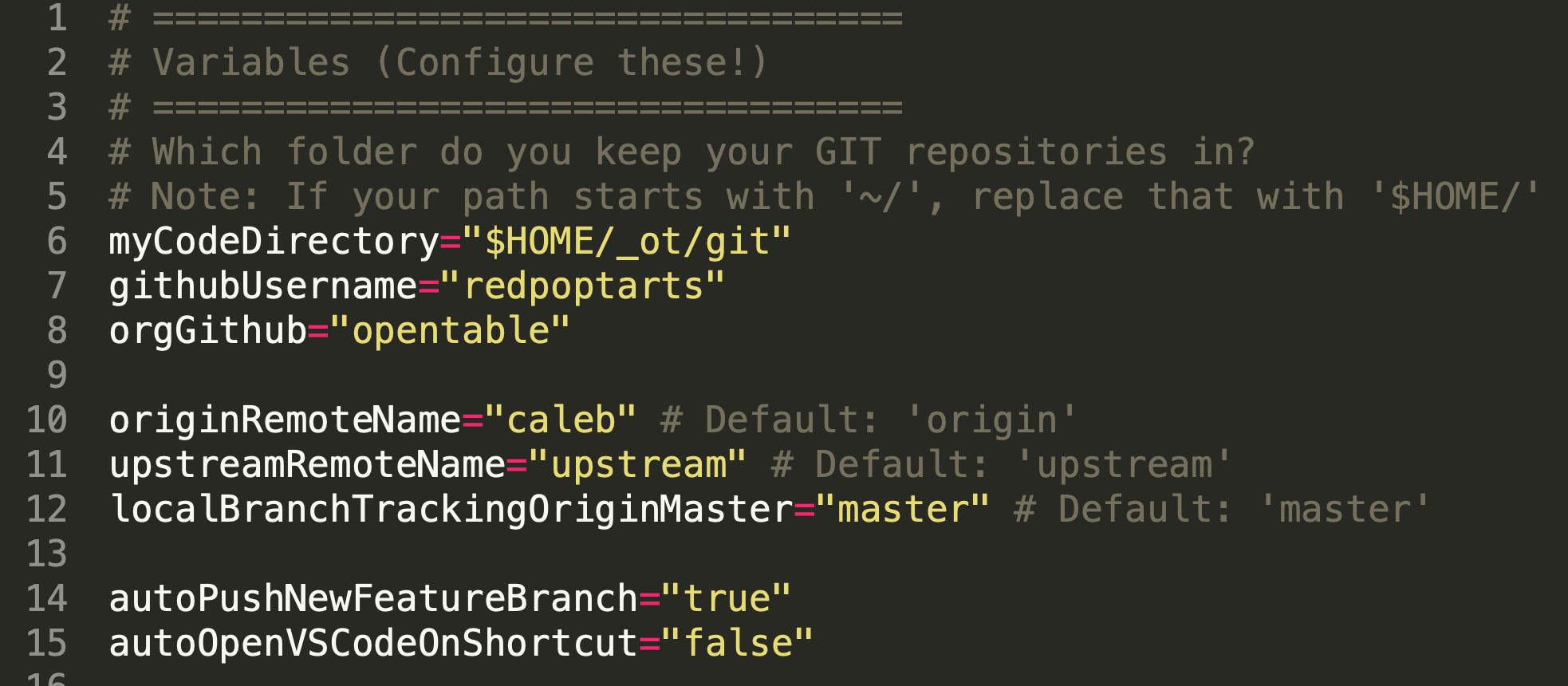 myCodeDirectory: Specify a single folder where most of your GIT repo folders live. Note: This string cannot contain '~'. You should instead use$HOME.githubUsername: Your GitHub UsernameorgGithub: Such as"opentable"originRemoteName: Frequently your first name, ororiginupstreamRemoteName: Commonly 'upstream'localBranchTrackingOriginMaster: Commonly 'main', 'master', or 'base'autoPushNewFeatureBranch: Use "true" or "false". When "true", new branches that are created will automatically push to your remote and configure tracking branchesautoOpenVSCodeOnShortcut: Use "true" or "false". When "true", the script will open the repo in VSCode after the script completes.