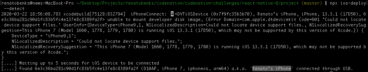 $ ios-deploy --detect # to get and display the connected deviceThe result of the above command should look like the image below: