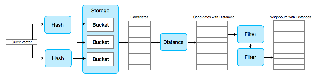 neighbours() hashes vector v with all configured LSHs, collects all candidate vectors from the matching buckets in storage, applies the (optional) distance function and finally the (optional) filter function to construct the returned list of either (vector, data, distance) tuples or (vector, data) tuples.
