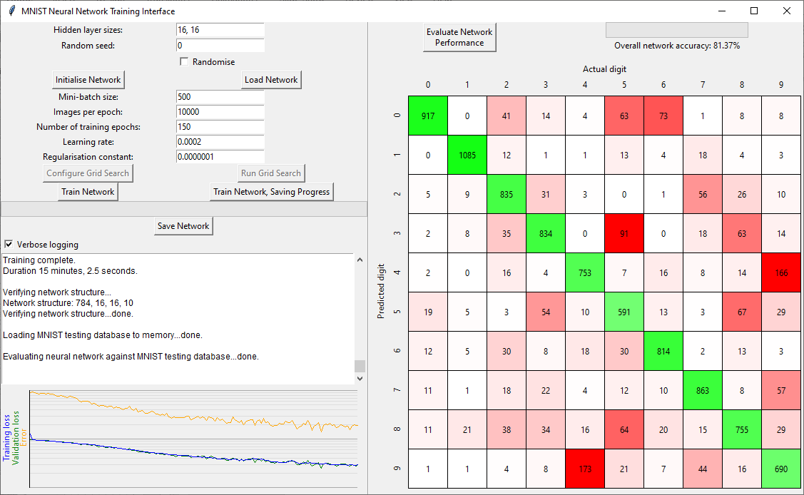After training is complete, the confusion matrix is calculated for the complete MNIST test database. Tooltips are provided if you hover over any of the numbers in the confusion matrix, which show the indices of the MNIST test images that fell into that classification box. You can also perform this calculation after initialisation or loading of a network to check performance.