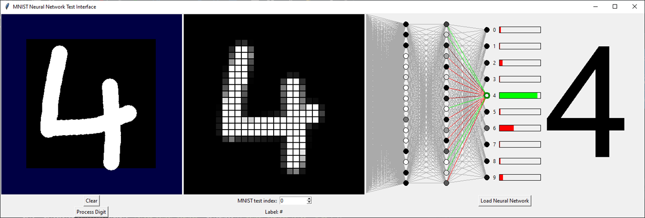 The testing GUI is simpler in operation compared to the training GUI. The left canvas area allows user graphical input, clicking Process Digit discretises the user's input into the middle area of the GUI. This shows the input in the standard 28x28 grid of the MNIST database. Alternatively, the user can use the numerical entry box to select one of the 10,000 MNIST test database images (perhaps to inspect some red boxes from the network's confusion matrix).