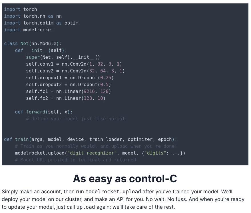With one line of Python, anyone can deploy their ML model to a scalable, internet-accessible inference API powered by ModelRocket. ModelRocket takes care of scaling the number of servers running the model, updating the model when you retrain it, and making sure the API is secure, enabling you to focus on building an amazing app-not on deploying it.