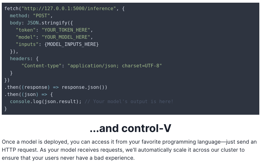 ML models are becoming increasingly easy to create, but model deployment hasn't caught up yet. It can take hours for an ML developer to get their model deployed into an internet-accessible API, and forget making it scalable. We realized that this problem is widespread, and that we could do something about it.