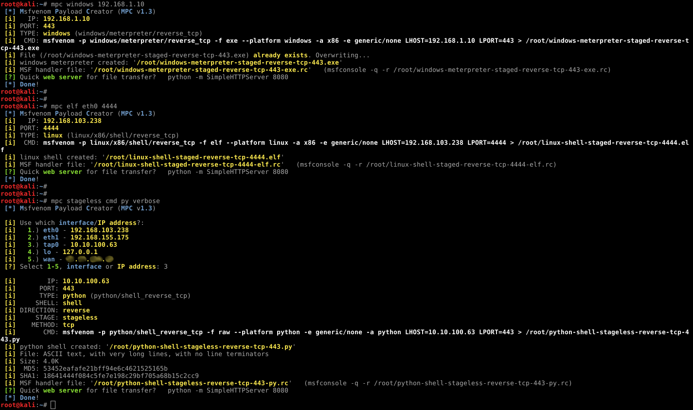 Fully automating msfvenom & Metasploit is the end goal (well as to be be able to automate MPC itself). The rest is to make the user's life as easy as possible (e.g. IP selection menu, msfconsole resource file/commands, batch payload production and able to enter any argument in any order (in various formats/patterns)).