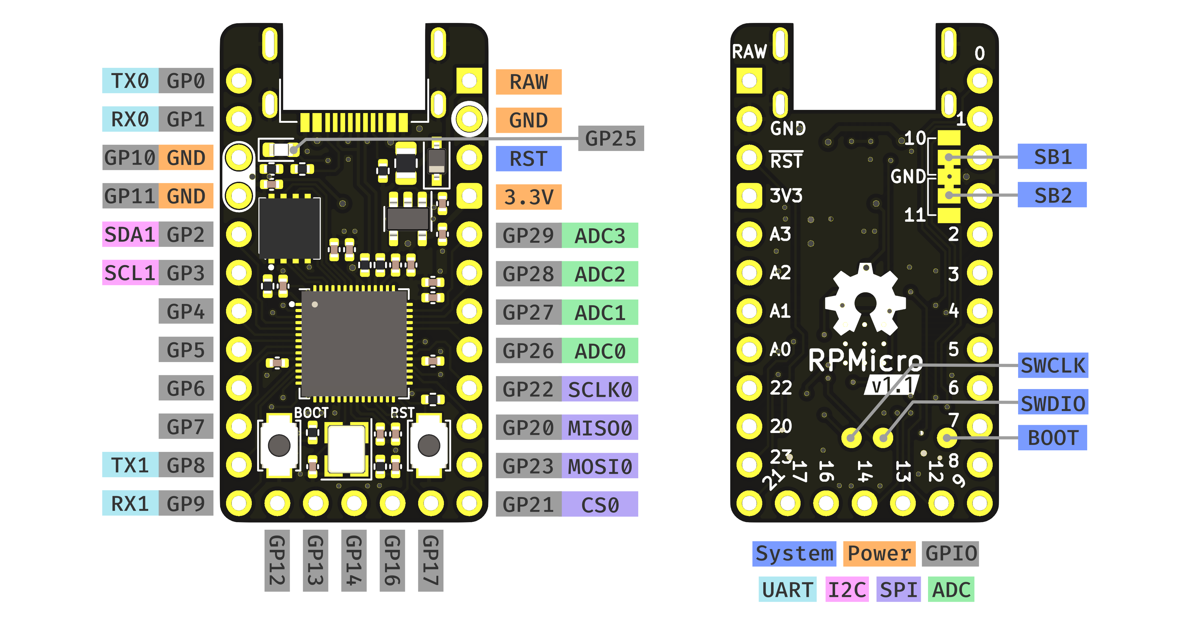 - SparkFun Pro Micro - RP2040 compatible pinout, with additional 5+2 pins (Elite-C and Elite-Pi style, but the pinout not identical to Elite-Pi).