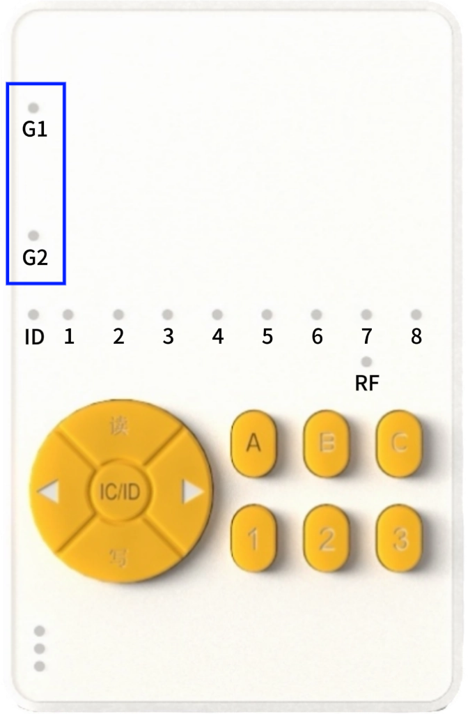熊猫二代即可模拟两组,每组8张,一共是16张IC卡,熊猫三代也是如此。G1和G2是卡组指示灯,当G1灯亮起说明当前在第一卡组,G2灯亮起说明当前在第二卡组。长按右键可以在两组间切换。