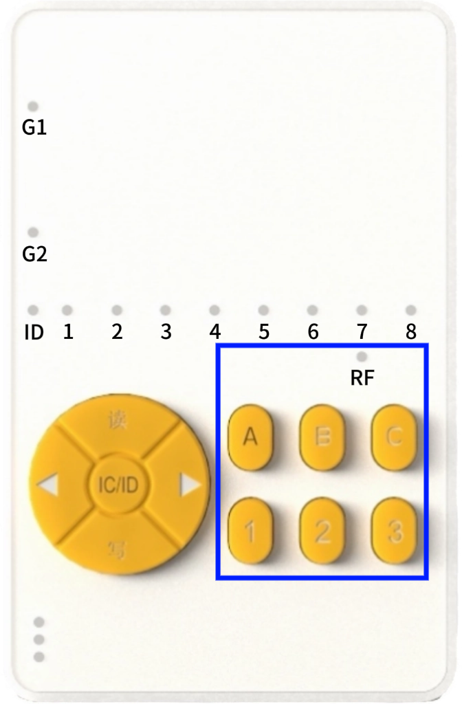RF灯为射频指示灯,该灯有红绿蓝三种颜色,表示了三组按键。通过同时按住A+B键可以在三组间来回切换。每组有ABC123六个按键,也就是说一共可以模拟3×6=18个按键。