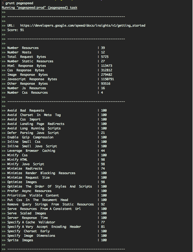 - grunt-pagespeed - uses Google's PageSpeed service to run a number of different speed tests against your page for mobile or desktop.