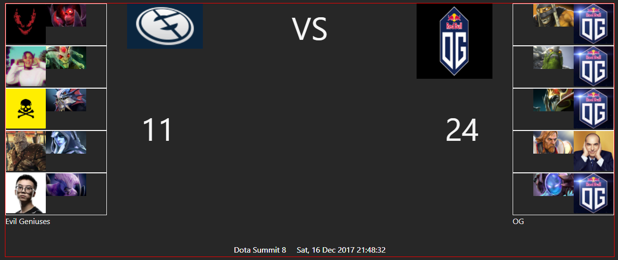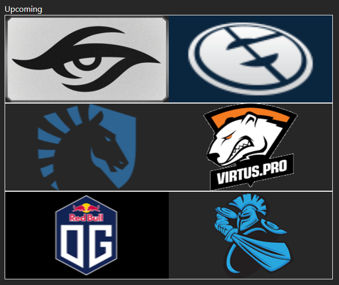 - Upcoming matches, a list of matches that are soon to be played. Left team (represented by the team logo) vs Right team