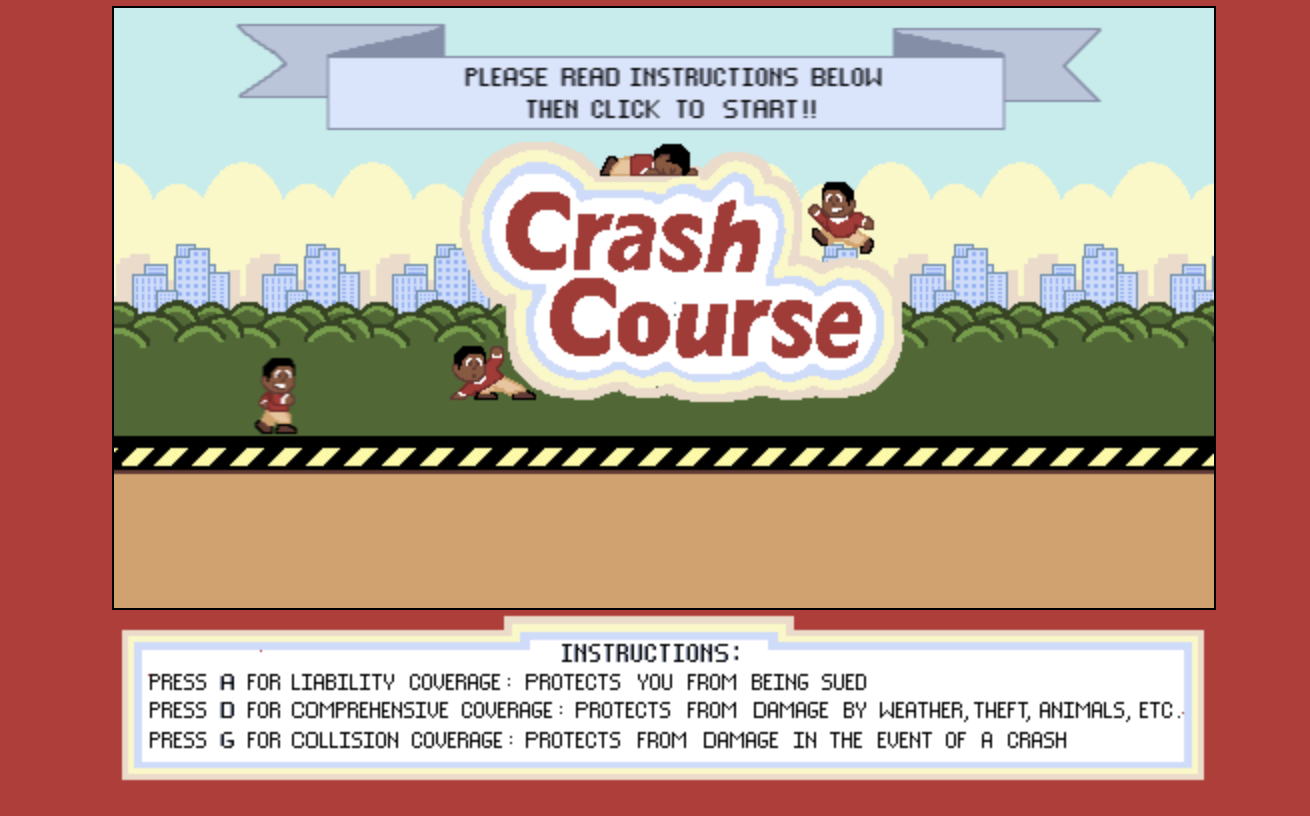 Crash Course is an endless runner game intended to help the player differentiate what the small capital letters mean on their insurance card. The simple JavaScript game features Jake having the run of his life, while hoping that the user inputs the correct key, allowing him