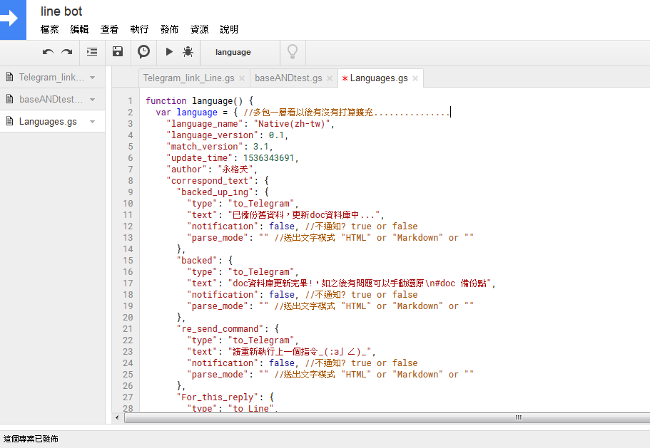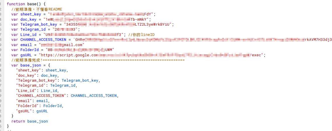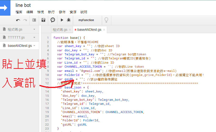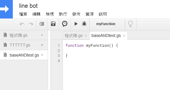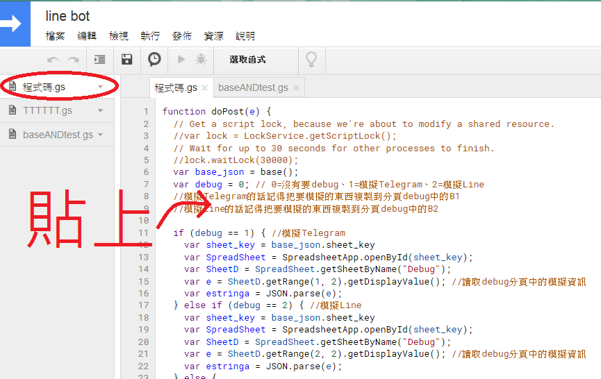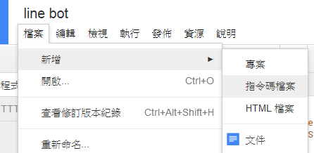 三個gs檔(google apps script),並將v3其中的"Telegram_link_Line.gs"的內容複製在一開始給你的"程式碼"區內。