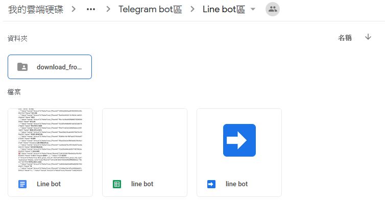 一個資料夾(用來放來自Line的媒體),推薦名稱叫 "download_from_line"(如果Google空間爆了bot會罷工喔,一般帳號有15G應該還好,如果是這個bot的東西占滿空間可以去"自己的TGbot"->"更多設定"->"丟棄舊檔"來丟到垃圾桶)