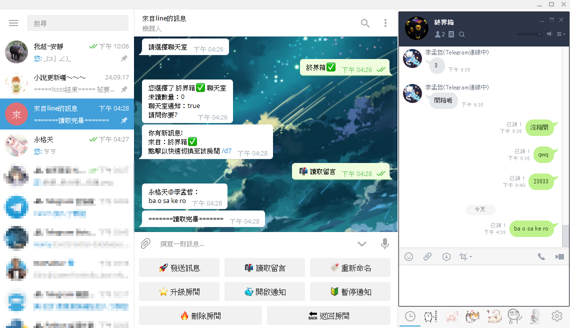 因為我以前的手機容量不大,Line太佔空間,所以只好用Telegram來間接使用Line