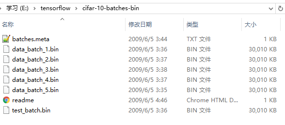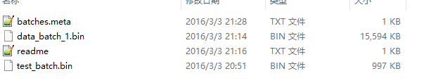 binData.images2BinaryFile( filefolder, fileLists, image_labels, binfile );到这里,已经制作好了二进制数据集,我很懒,想直接基于tensorflow/models/image/cifar10模块的源码跑我定义的数据集,想想只要跟cifar10数据集类似,那肯定没什么问题,下面是官网上下载的cifar-10-binary.tar解压后内容: